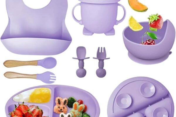 Original price was: ₹2,999.00.₹1,299.00Current price is: ₹1,299.00.Silicone Baby Feeding Set, Complete 8-Piece Baby Led Weaning Set | Baby Feeding Product,Suction Plate, Bowl,Cup, 2 Spoon, 2 Fork and Bib for Baby (Purple)
