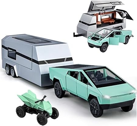 - Iconic Geometric Design & Heavy-Duty Build Own the most recognizable silhouette on the road. This 1:24 scale Cyber truck is crafted from high-grade zinc alloy with a realistic stainless-steel finish. Accompanied by a matching detachable caravan, this set captures the rugged, futuristic spirit of the world’s most advanced electric pickup.