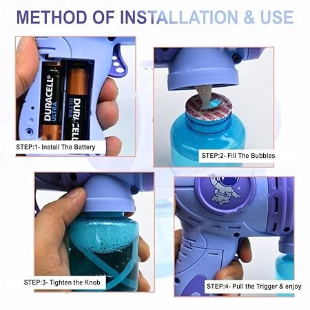 Everything you need to get started is in the box! Each set comes with the Space Bubble Gun and two bottles of concentrated bubble solution. Just add batteries (not included), and you’re ready for instant bubble-blasting action.