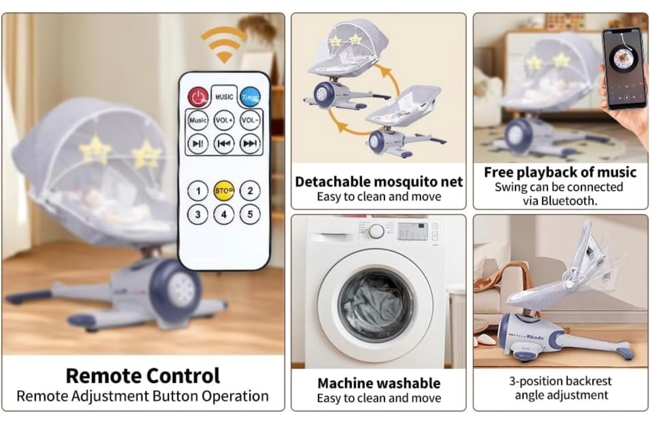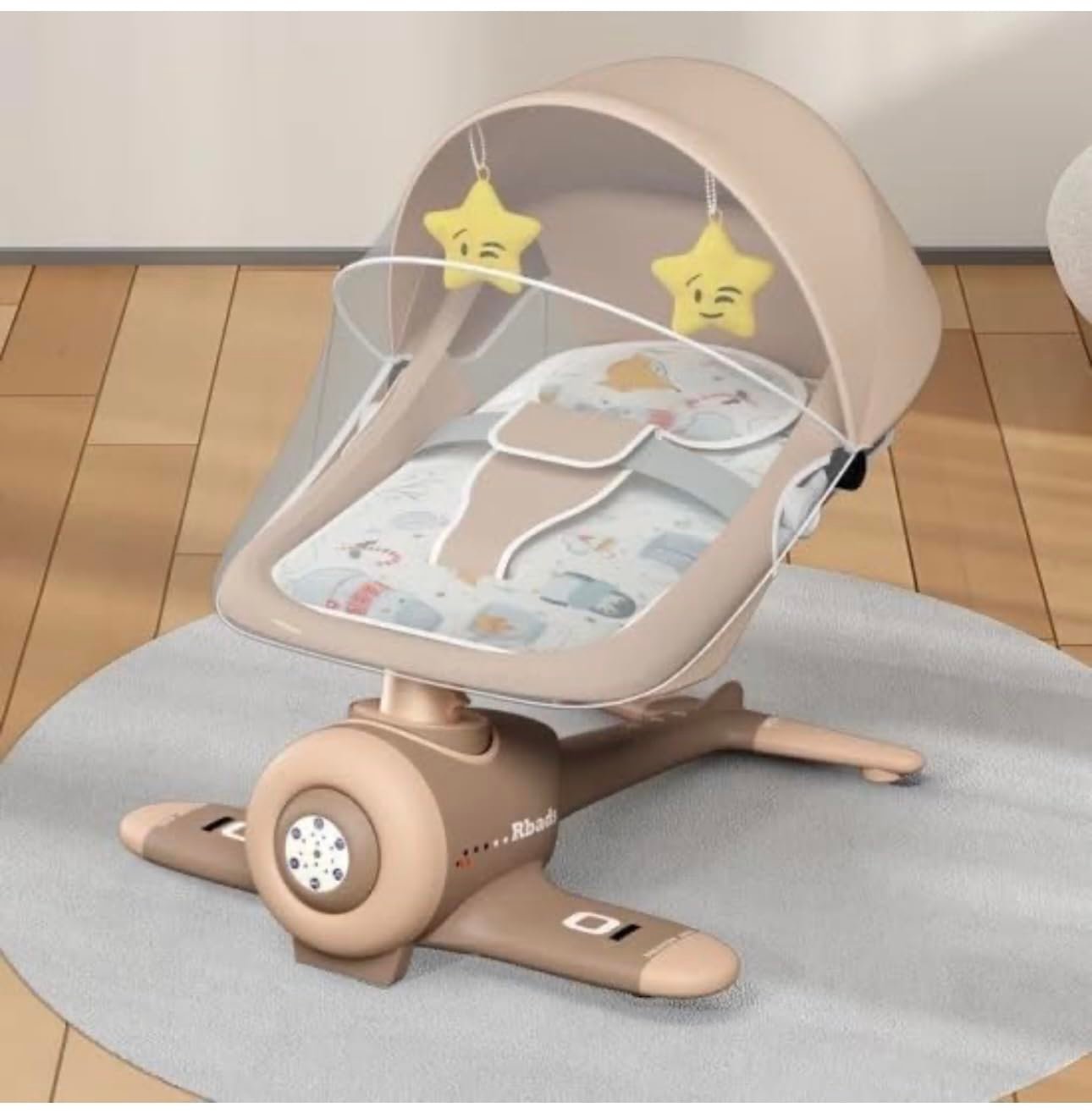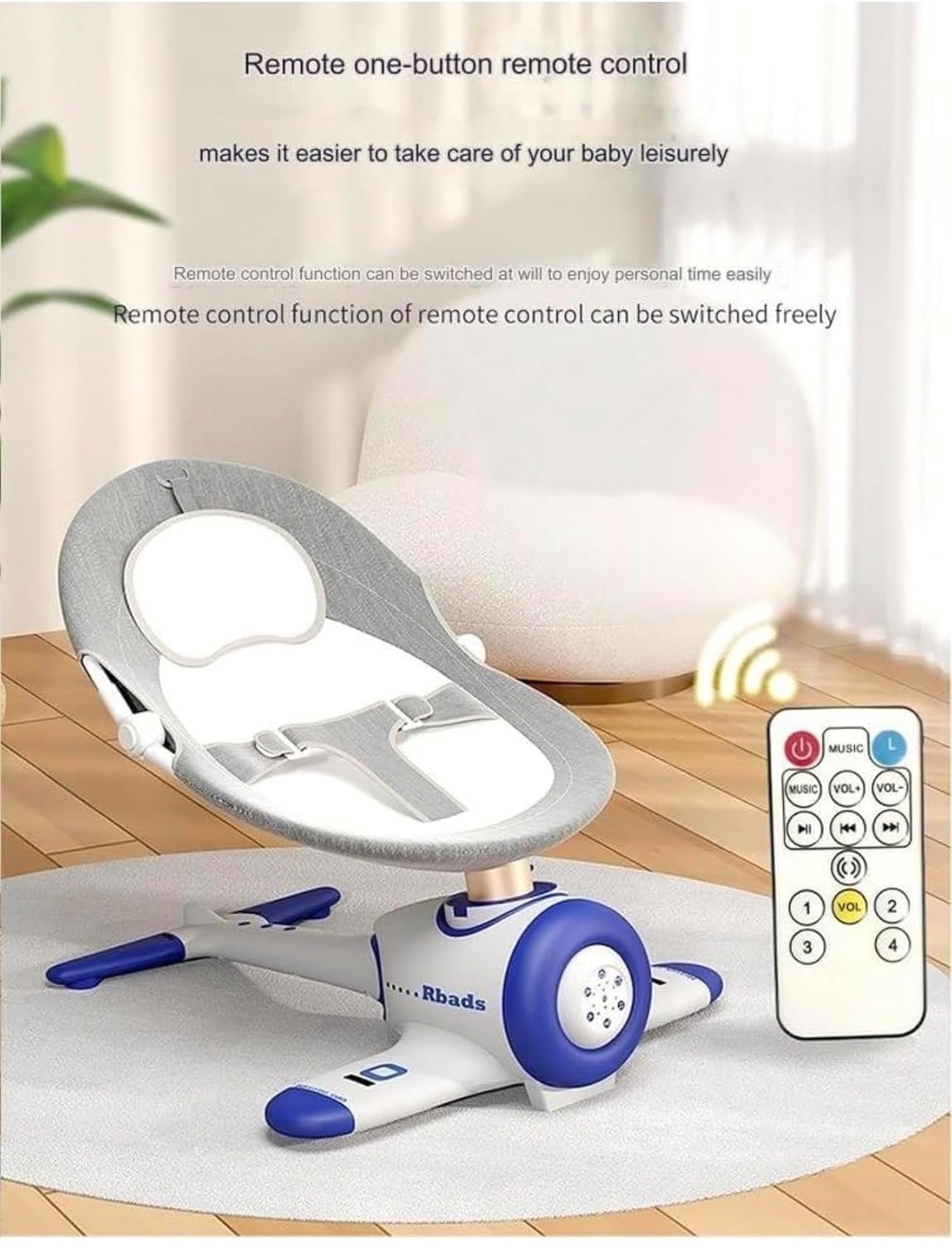 - [ Perfect Accessories & Bluetooth Music Player ] – 1 x Baby Rocking Chair ,1 x Mosquito Net ,, 2 x Plaything , 1 x Headrest , 1 x USB + Adapter, This baby rocker for infants has preset lullabies. It also allows you to play your baby’s favorite soothing songs or nursery rhymes from your phone, offering peaceful or joyful moments for your little one.