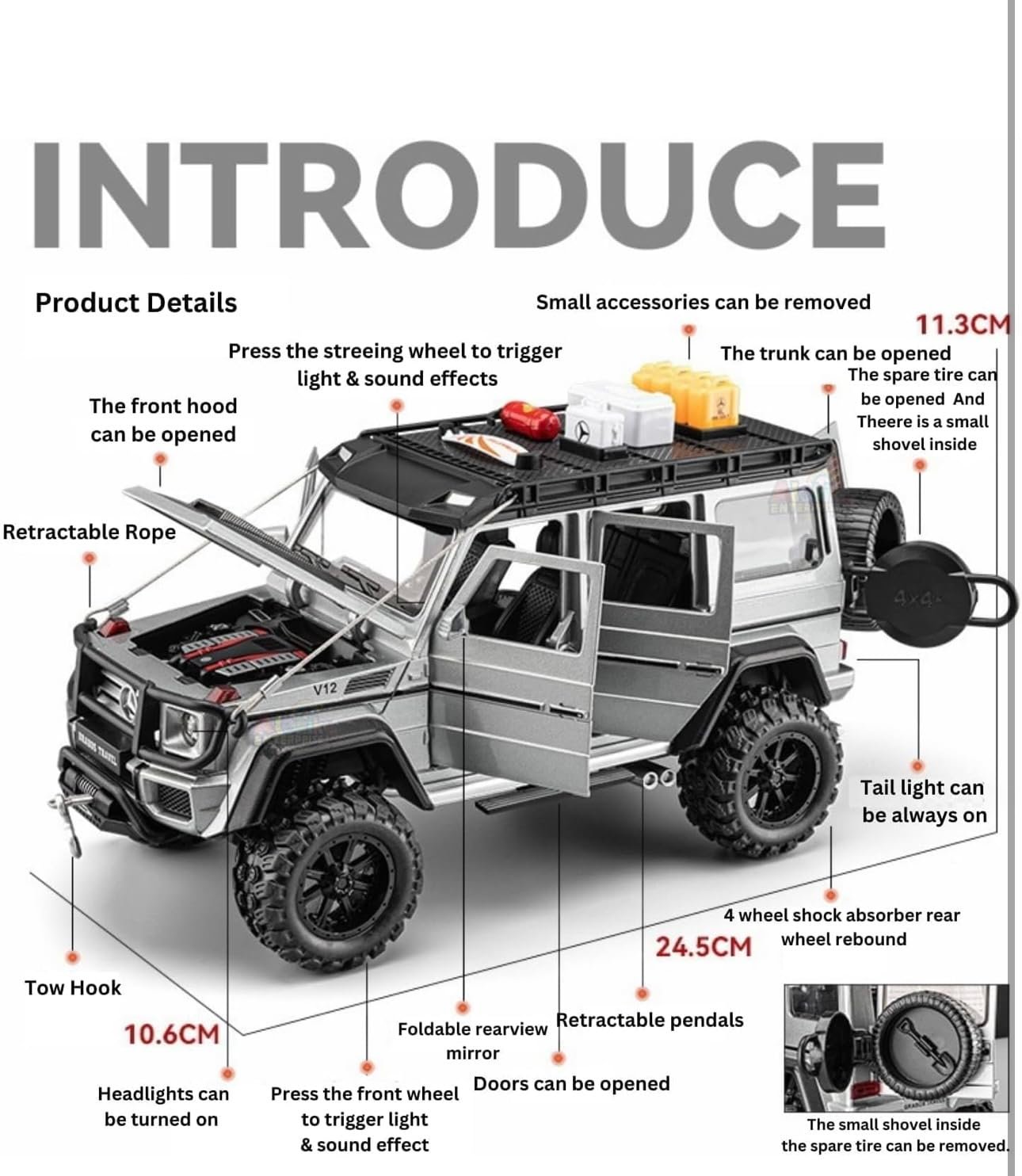 - 1.Press the front wheel to trigger the engine sound and front and rear headlights. Three kinds of realistic sound (engine start , horn & alarm sound), maybe a little noisy. Opening doors, trunks or pressing the front wheel produces sounds&lights. The rear wheel got pull back power
