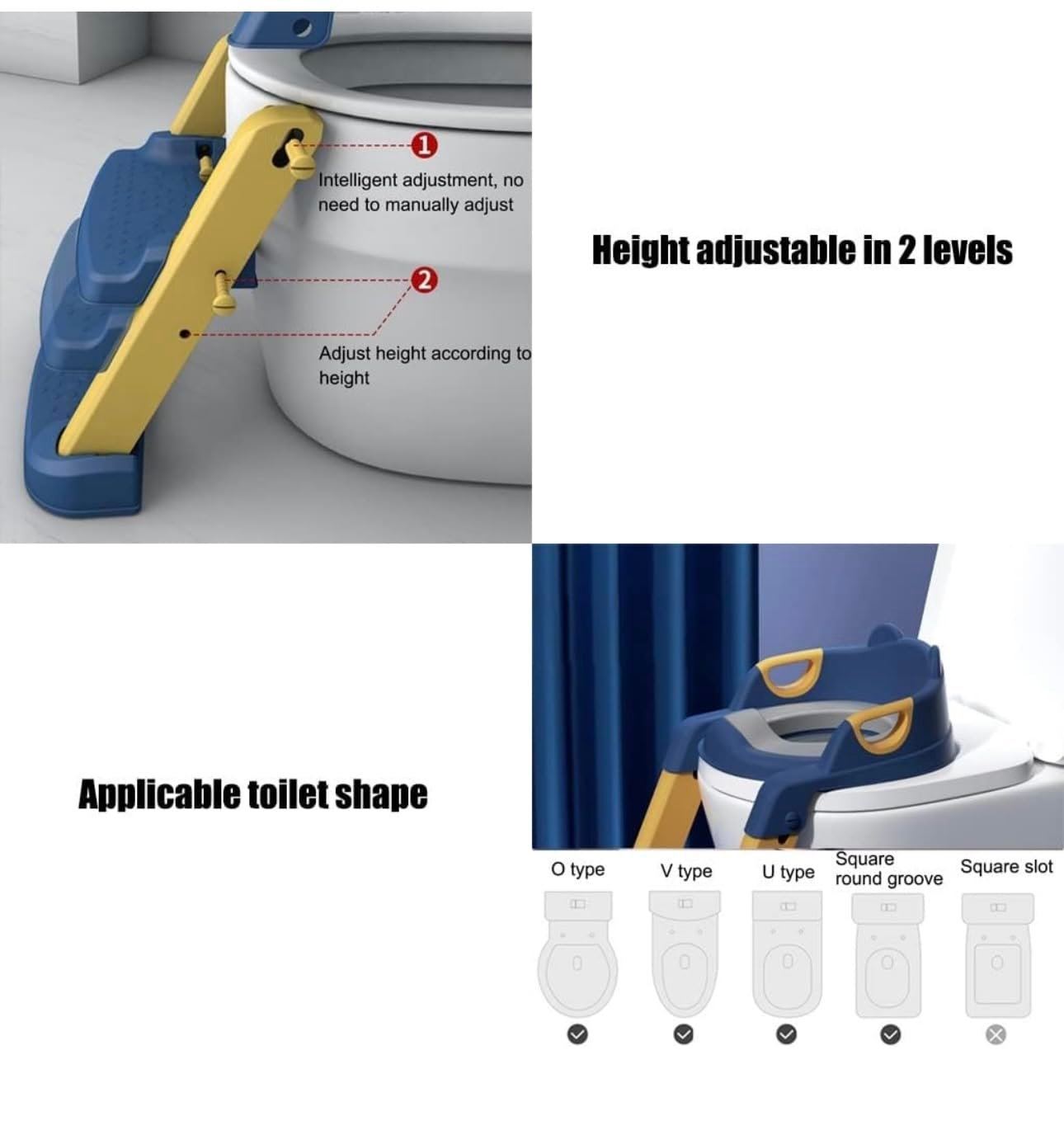 - 【Adjustable height, suitable for toilet shape】: This Toilet Training Seat pedal height can be adjusted in 2 levels, which can be adjusted according to height requirements; the top can be adjusted intelligently without manual operation; it is suitable for most shapes and sizes of toilets, such as: V-shaped, U-shaped, O-shaped and square round-slot toilets are not suitable for square square-slot toilets