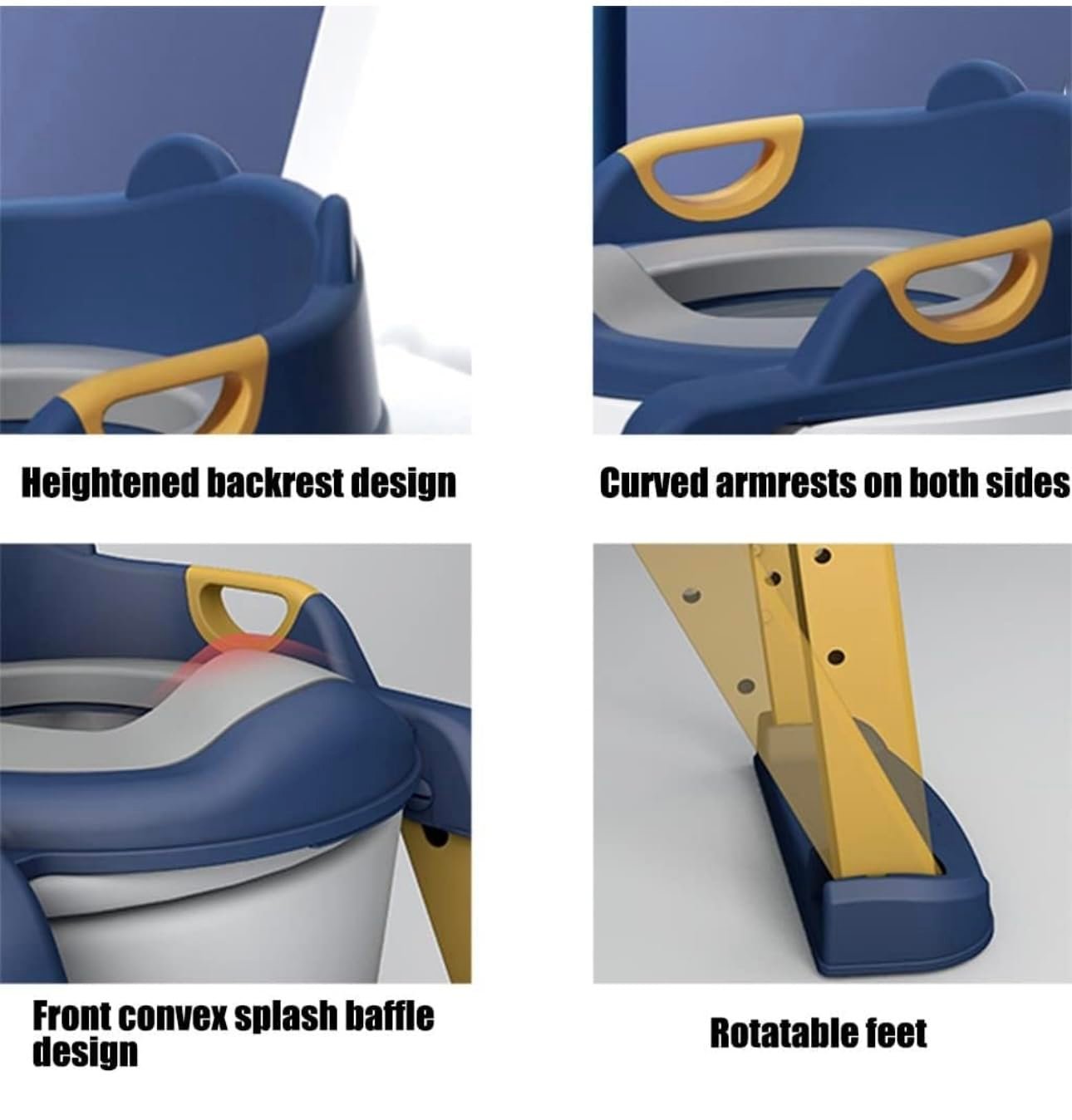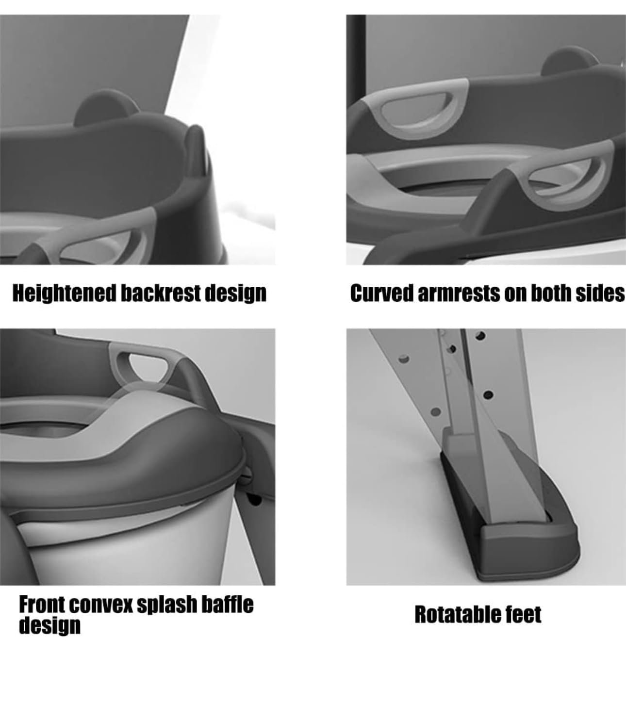 - 【Intimate design】: Heightened backrest design, protects the spine and prevents hunchback, and develops good sitting habits; curved armrests on both sides are designed to fit the curvature of the fingers, and the grip is firm; the heightened baffle design prevents urine from splashing; Rotate the bottom, adjust the angle back and forth, adapt to different terrain