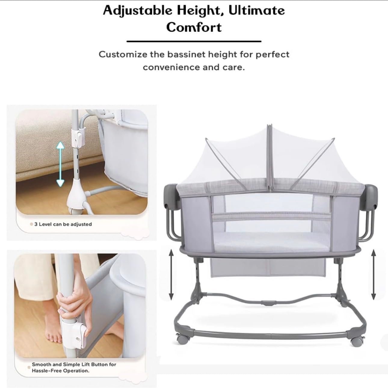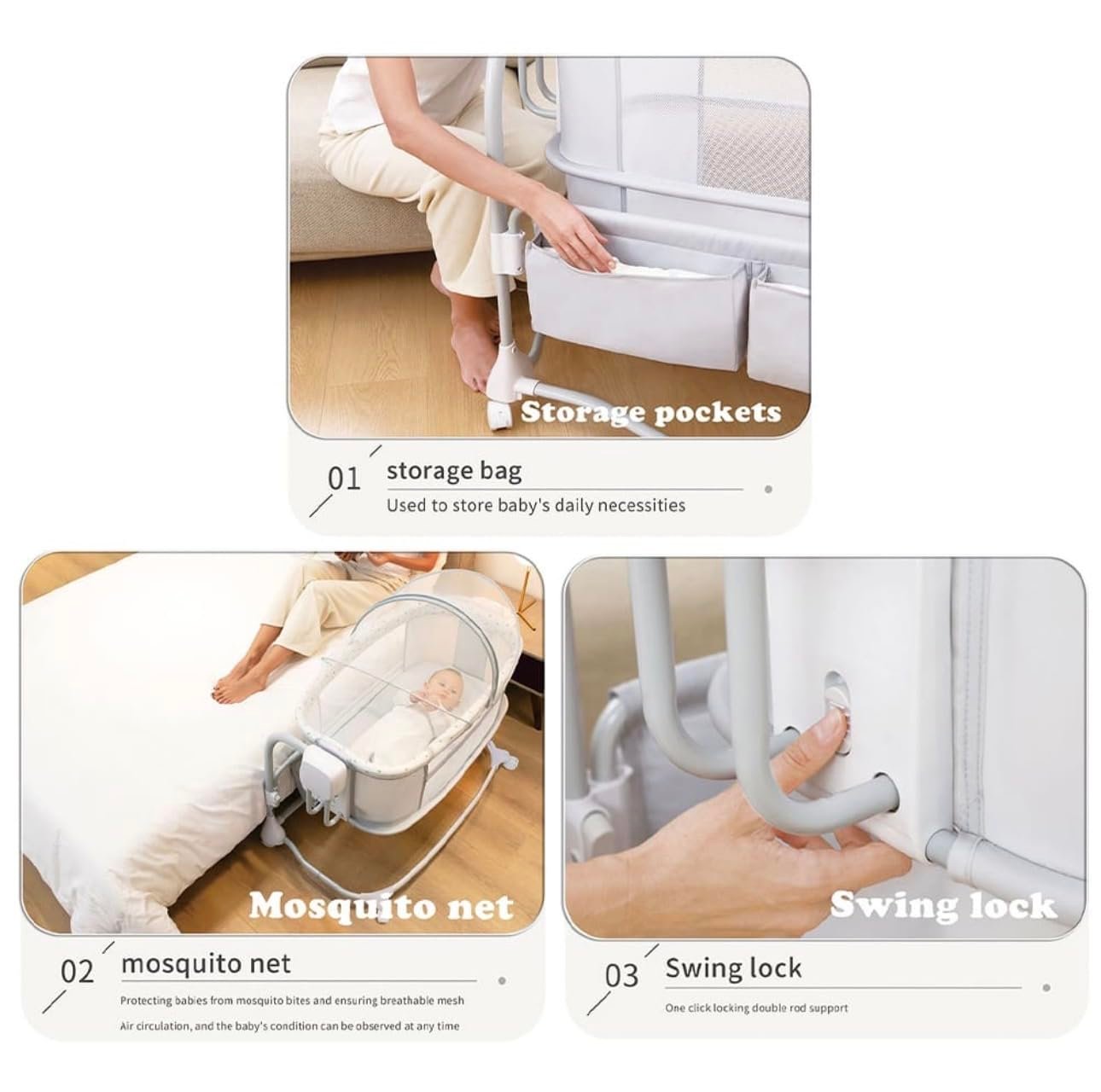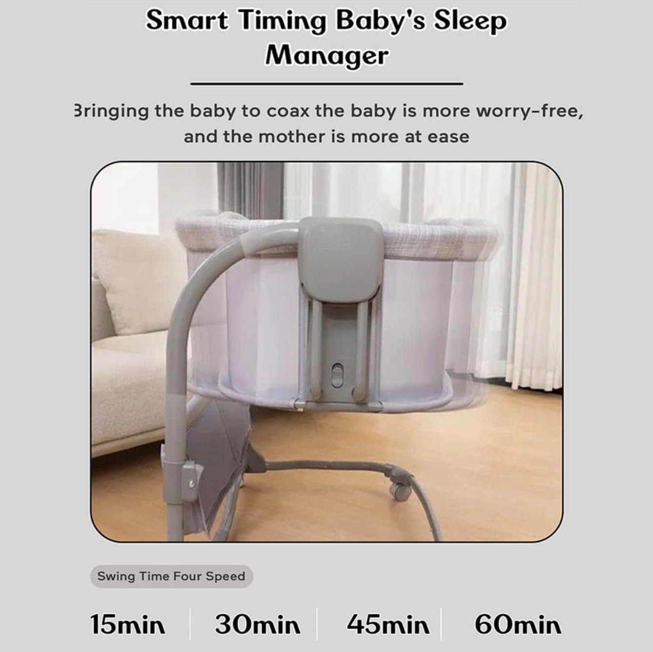 - Three-Speed Swing Motion: The cradle offers three swing speeds, allowing you to choose the perfect motion to calm and relax your baby. Whether your baby prefers a gentle sway or a faster rhythm, this feature ensures comfort and convenience.