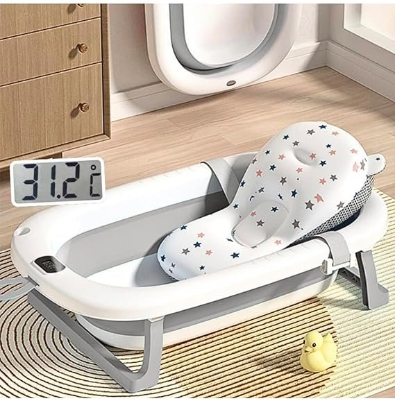 Premium Splash & Play Foldable Baby Bath Tub with Cushion & Temperature Indicator, Thickened Edge Design, Soft and Durable PP Material, for 0-24 Months (Multicolor)