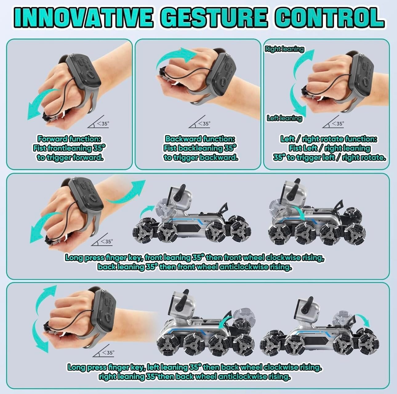 - Dual Control Modes:This car is not only controlled by remote, but also by hand gestures with a hand-controlled rc watch. Just move your hand and the car will follow your movements, whether you want to go forward, backward, turn left, turn right, spin, or flip. With its high sensitivity and simple operation, the hyper go rc car is perfect for anyone who loves hand-controlled rc cars.