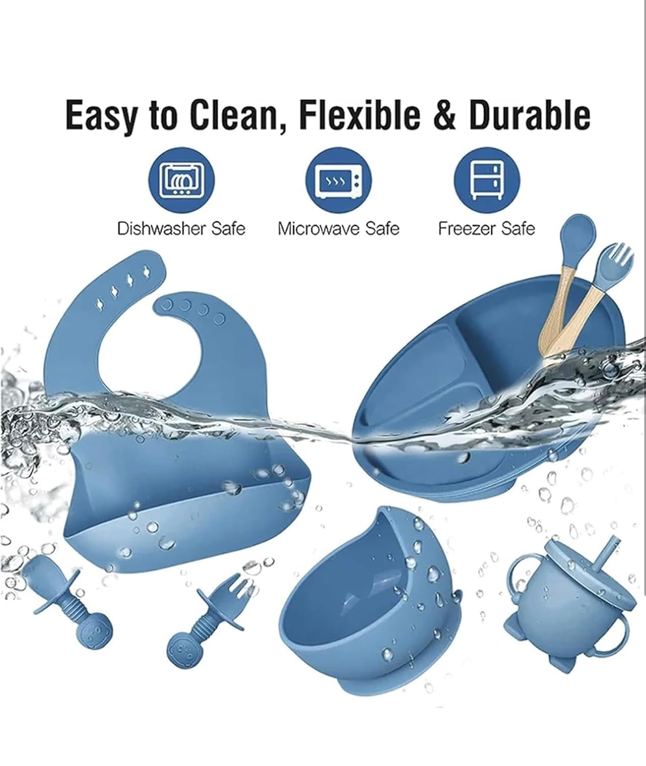 Silicone Baby Feeding Set, Complete 8-Piece Baby Led Weaning Set | Baby Feeding Product,Suction Plate, Bowl,Cup, 2 Spoon, 2 Fork and Bib for Baby (Dark Blue)