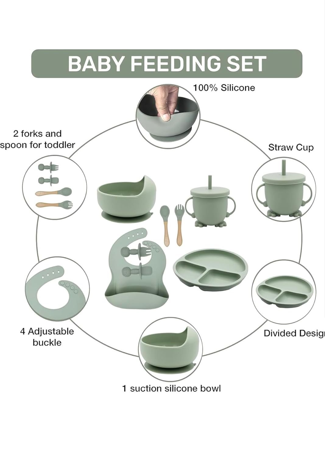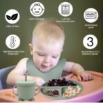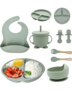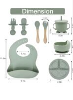 Silicone Baby Feeding Set, Complete 8-Piece Baby Led Weaning Set | Baby Feeding Product,Suction Plate, Bowl,Cup, 2 Spoon, 2 Fork and Bib for Baby (Green)