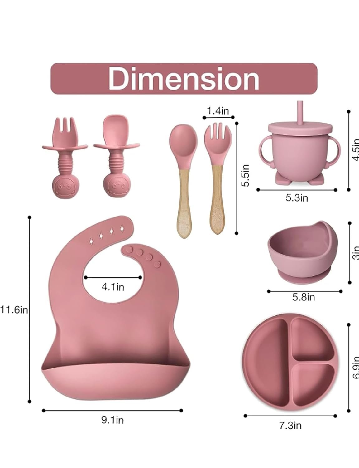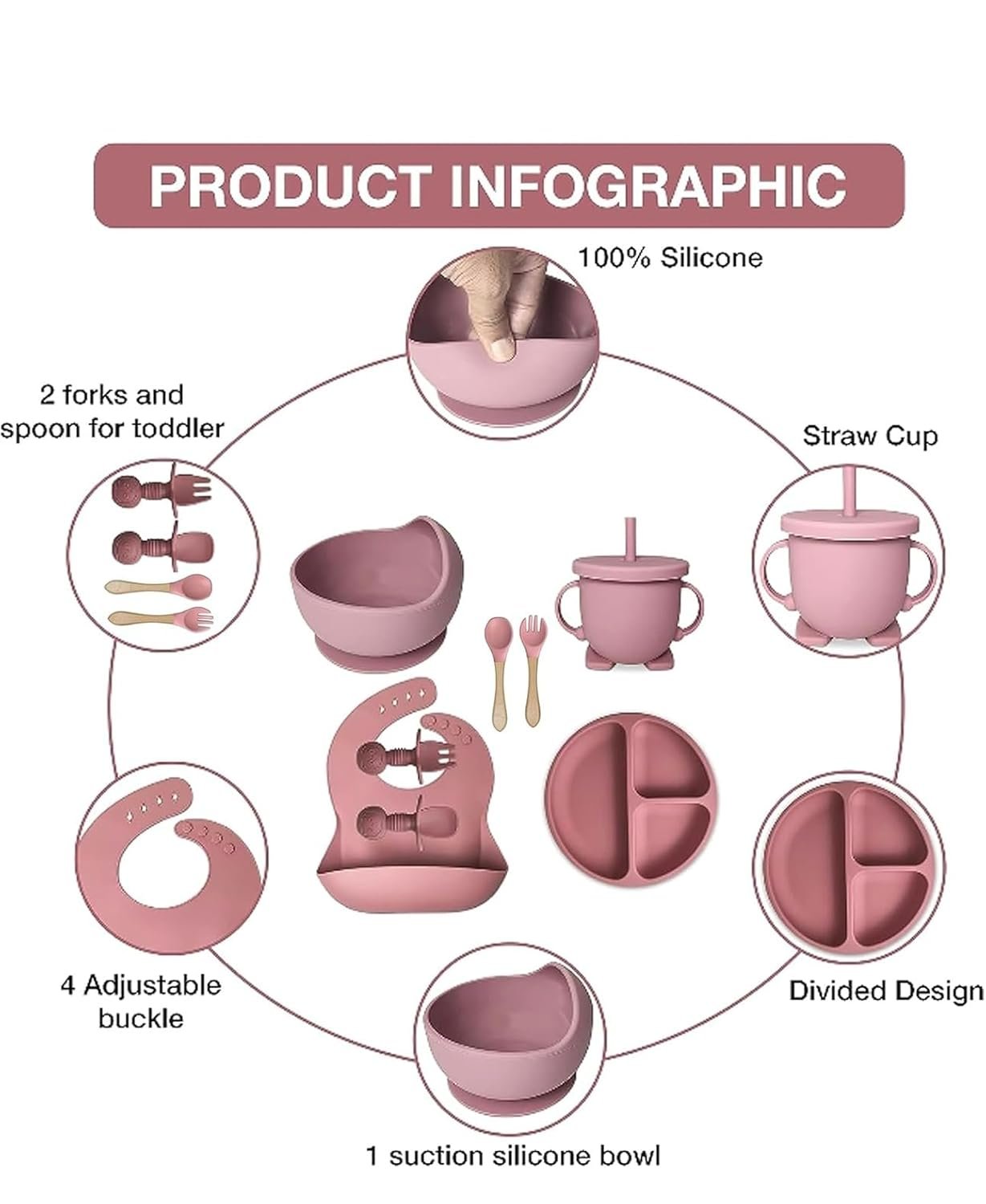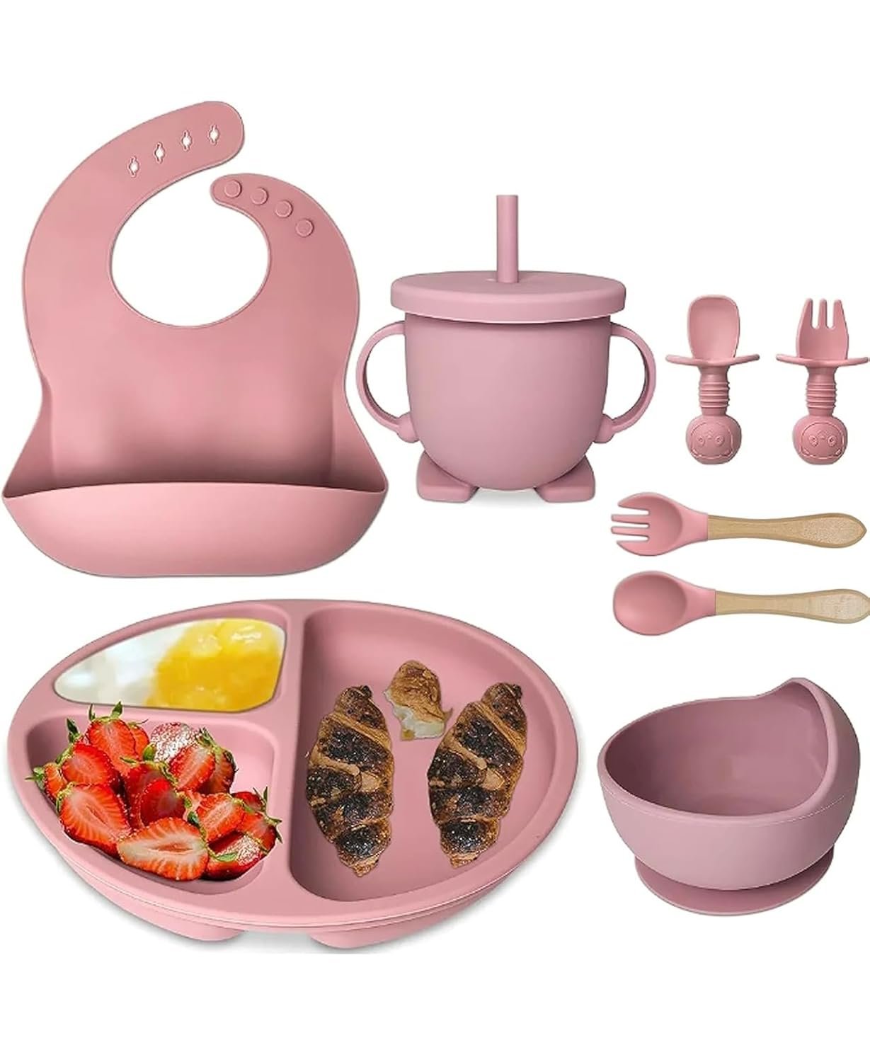 Silicone Baby Feeding Set, Complete 8-Piece Baby Led Weaning Set | Baby Feeding Product,Suction Plate, Bowl,Cup, 2 Spoon, 2 Fork and Bib for Baby (Pink)