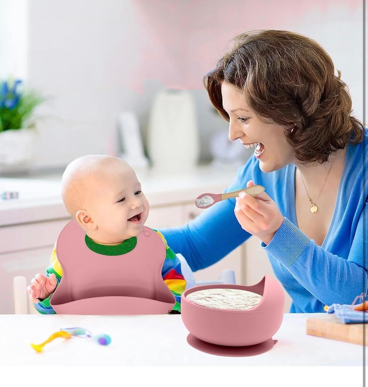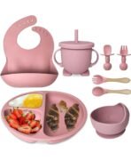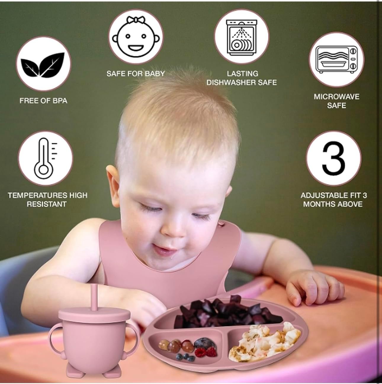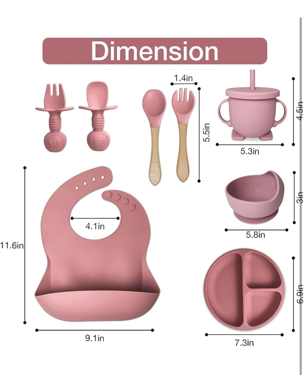 Silicone Baby Feeding Set, Complete 8-Piece Baby Led Weaning Set | Baby Feeding Product,Suction Plate, Bowl,Cup, 2 Spoon, 2 Fork and Bib for Baby (Pink)