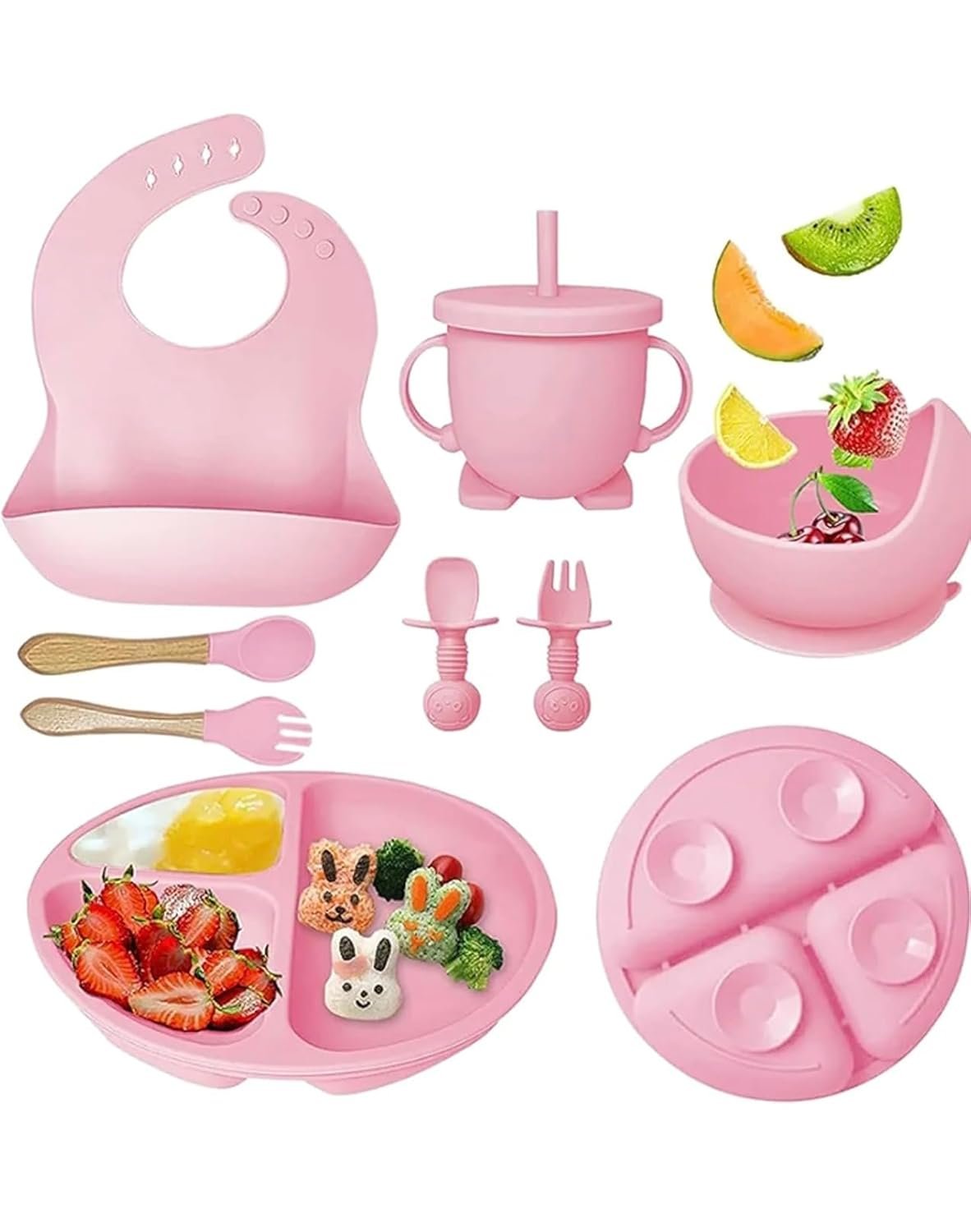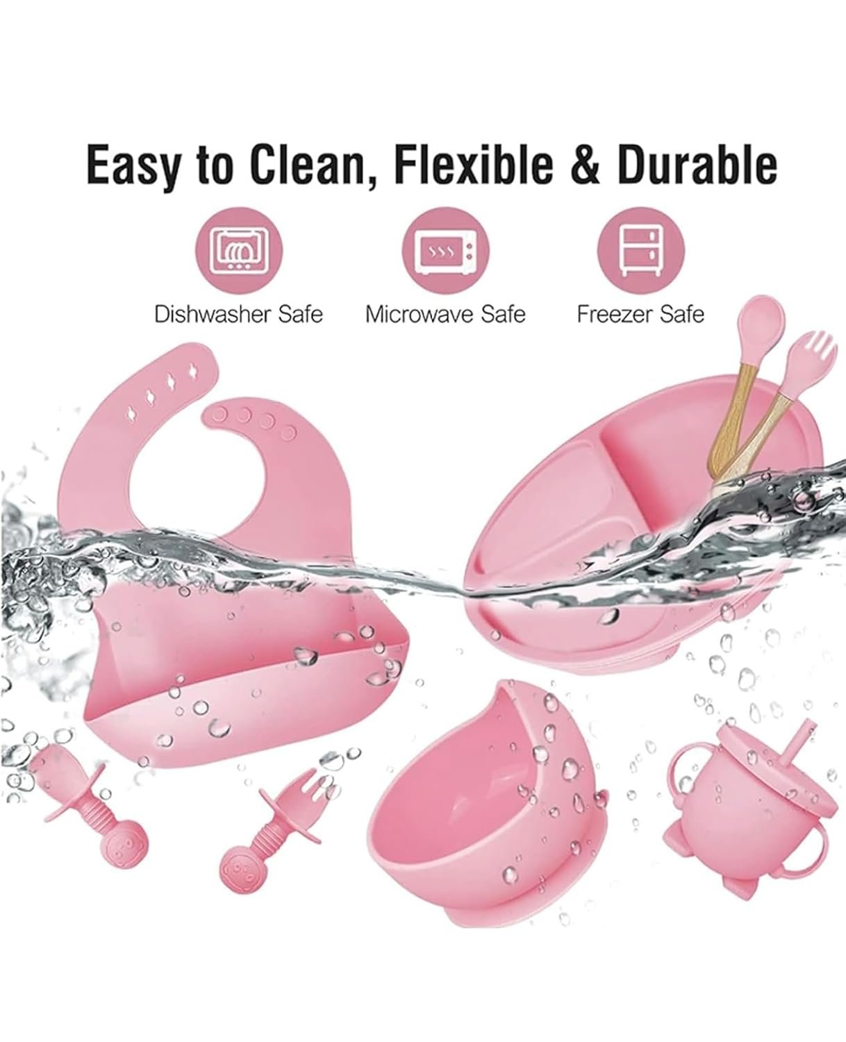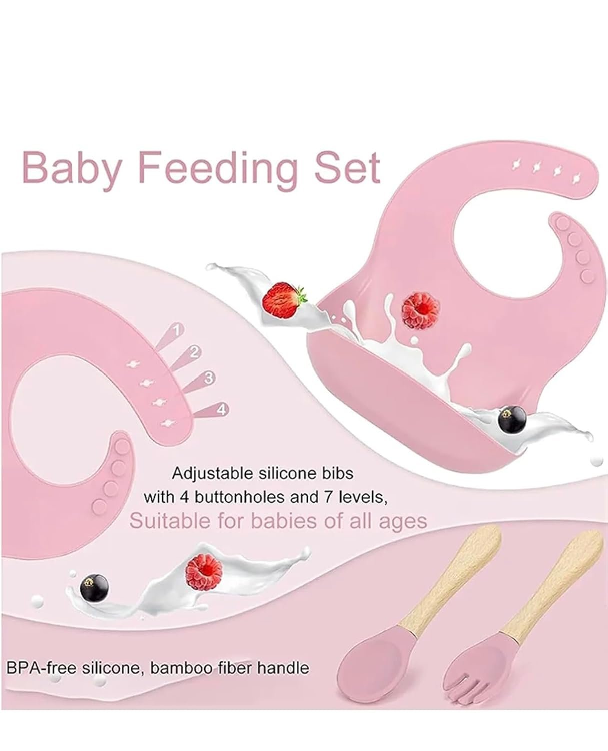Silicone Baby Feeding Set, Complete 8-Piece Baby Led Weaning Set | Baby Feeding Product,Suction Plate, Bowl,Cup, 2 Spoon, 2 Fork and Bib for Baby (Pink)