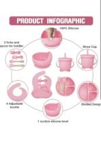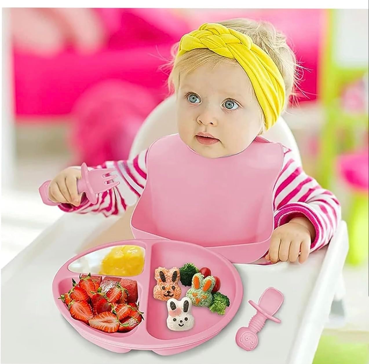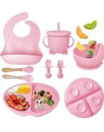 Silicone Baby Feeding Set, Complete 8-Piece Baby Led Weaning Set | Baby Feeding Product,Suction Plate, Bowl,Cup, 2 Spoon, 2 Fork and Bib for Baby (Rose Pink)