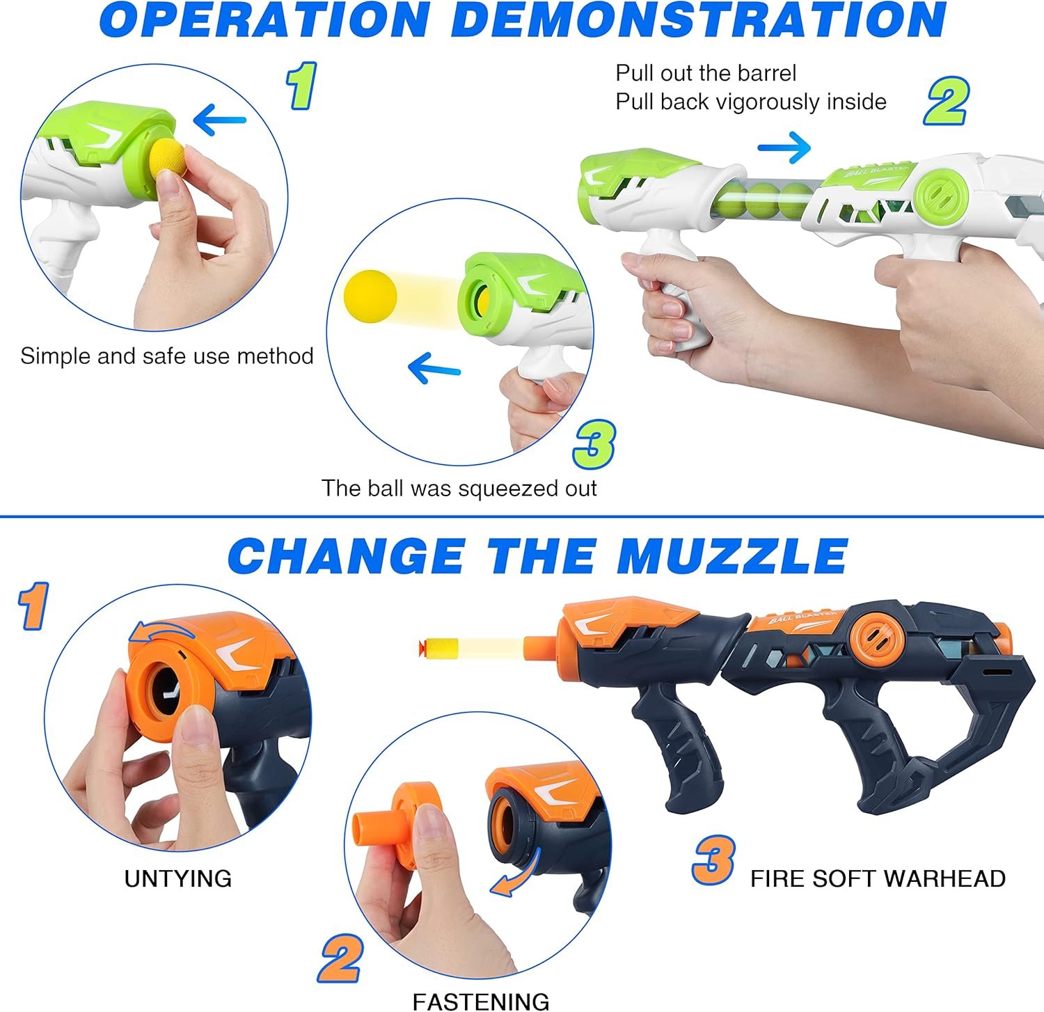 - Cool Air Pump Gun and Soft Ball: Air blast gun can change the muzzle to match different bullets, foam balls or soft bullets, which adds more entertainment to the game. The ball is made of EVA foam, very light, safe and harmless.Foam balls are collected on the belly of the astronaut. Easy to take out and recycle.